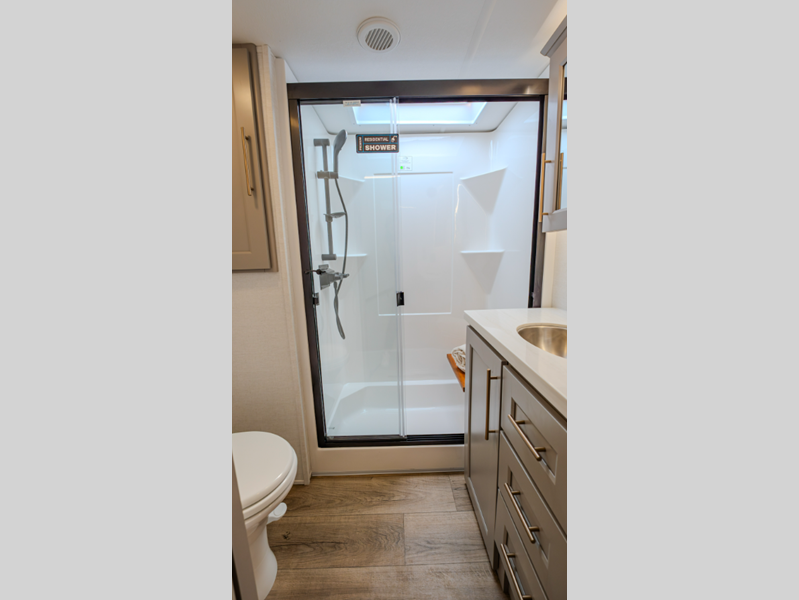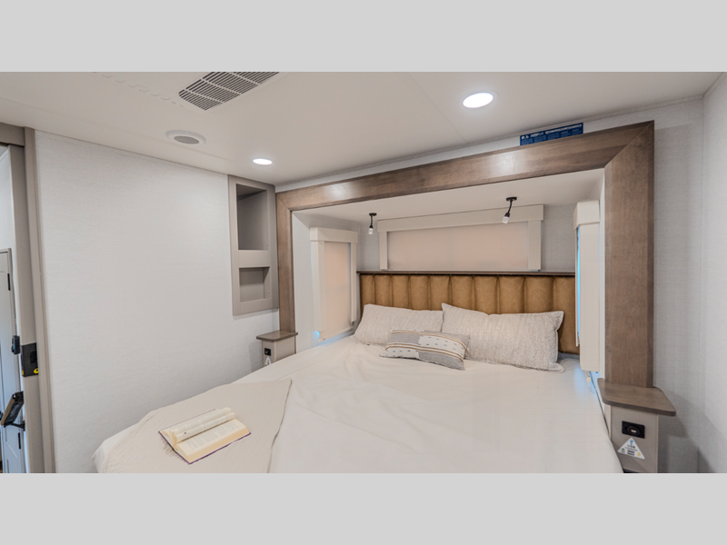 The Benchmark 8' 5" wide-body chassis, Mylar reinforced exterior seals, and insulated laminated rear wall will provide a durable fifth wheel made to last. There is a TSC - Touring Coil Suspension and Curt 8,000 lb. axles for the ultimate towing experience, and the 6-point hydraulic leveling will make set-up easier than ever. Head inside to find bronze hardware, atrium windows, a large residential shower, and roller shades throughout to provide privacy when you want it.