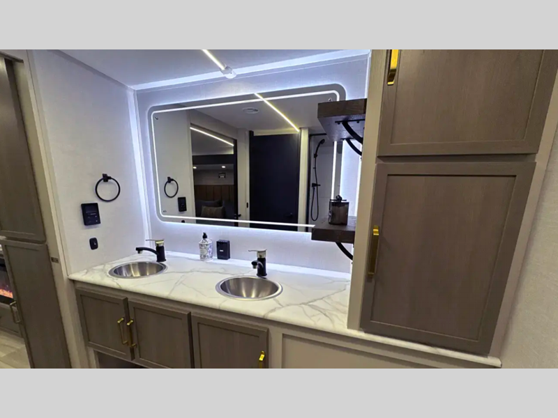 Sleeps 3 Slides 2 Length 33 ft 1 in Ext Width 8 ft Ext Height 11 ft Hitch Weight 1160 lbs Dry Weight 8243 lbs Cargo Capacity 1717 lbs Fresh Water Capacity 49 gals Grey Water Capacity 90 gals Black Water Capacity 30 gals Available Beds Custom King Refrigerator Type 12V Refrigerator Size 10 cu ft Cooktop Burners 3 Number of Awnings 1 Water Heater Type On Demand Tankless AC BTU 31500 btu TV Info LR 50" LED Smart TV Awning Info 19' with LED Lights Axle Count 2 Washer/Dryer Available Yes Shower Type Radius Electrical Service 50 amp Similar Floorplans