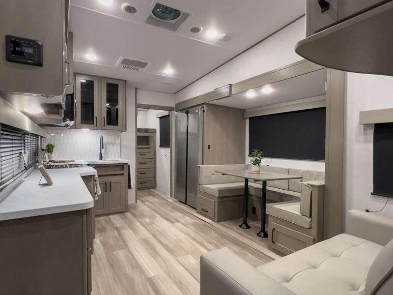Each fifth wheel has 90-degre turning radius capabilities which allows you to be comfortable driving in town and parking into your campsite. Some construction and Arctic 4-Seasons Protection package features include a one-piece TPO roof membrane, a heated and enclosed underbelly with circulating heat, 12V heat pads on the holding tanks, and a heated pass-through storage area so you can travel and enjoy any climate. The interior offers large panoramic slide room windows for great views, premium Congoleum flooring for durability, and an On Demand water heater.